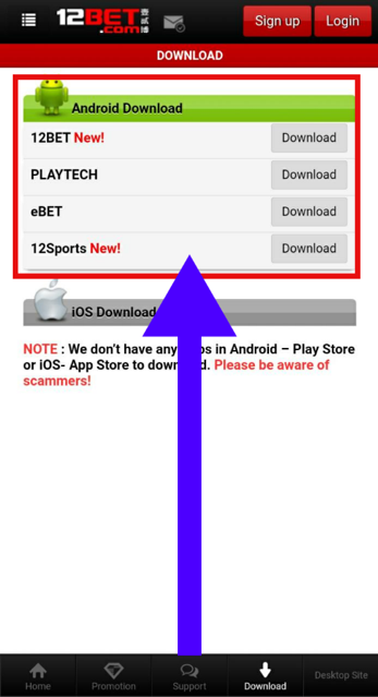 Step 2: At the bottom of the page, you will find a banner with the 12bet android app logo. Clicking this banner will trigger an automatic download process. When prompted choose to save the apk file. Once the download is completed, navigate to the download folder or optionally where you selected as the destination for the downloaded file. Open the file to begin installation.