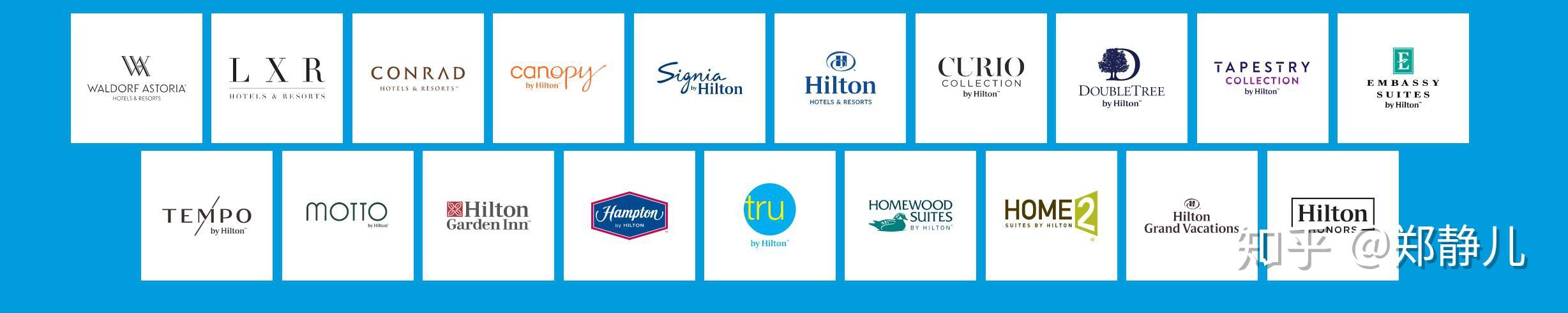 希尔顿酒店集团的品牌墙上也没有对旗下品牌进行分类,那依然按品牌豪华程度排序的主线来分类,这次分类将更为详细一点。